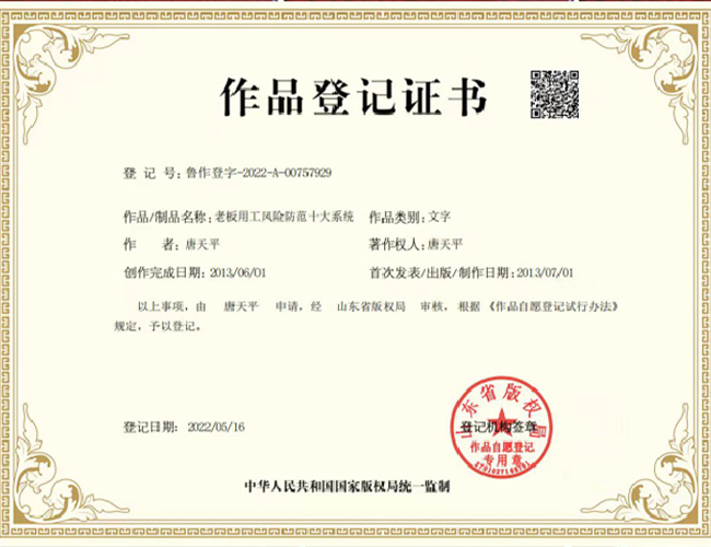 老板用工风险防范十大系统作品登记证书