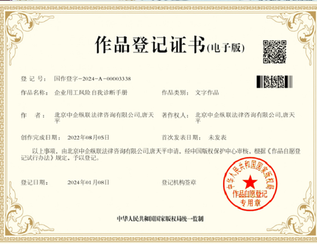 企业用工风险自我诊断手册作品登记证书