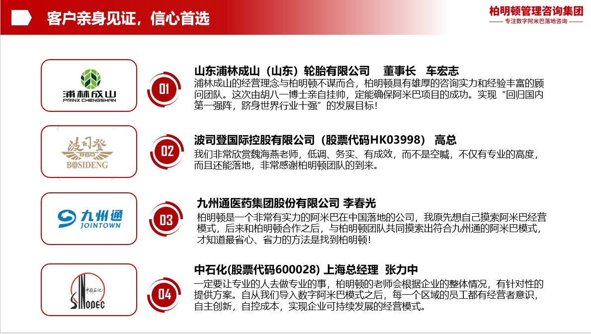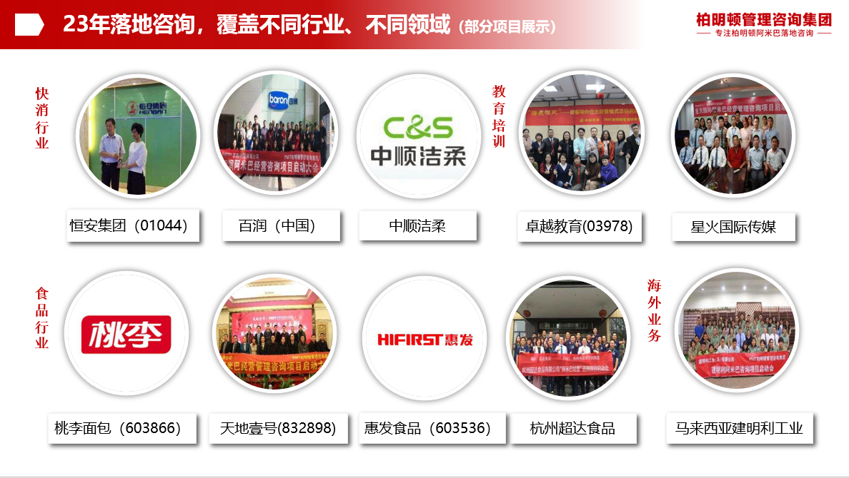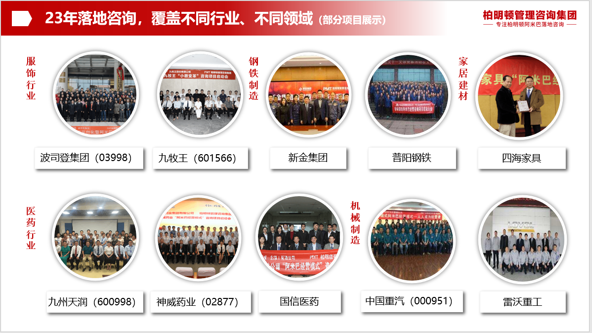 柏明顿管理咨询集团,成立于2000年,现在北京、上海、广州、深圳都建立了分公司,23年以来,为1200多家企业成功导入阿米巴咨询项目,可以说拥有多个行业的阿米巴经营落地的成功经验。并且柏明顿咨询是中国咨询行业协会常年顾问 ,中国管理咨询行业十大影响力品牌、值得信赖的中国管理咨询机构。目前,在全国60多个城市、开办了1000多场次培训、有20000多家企业受训。并且完成著书50余种、光碟10多种、创立管理模型16种。柏明顿是中国式阿米巴落地咨询第一品牌。