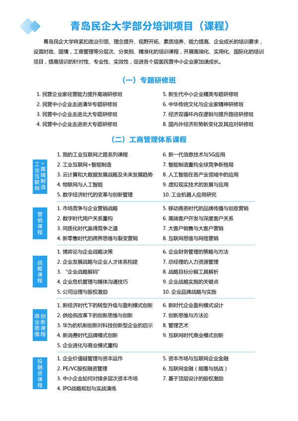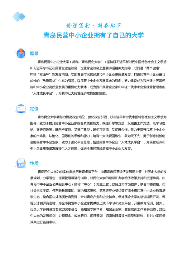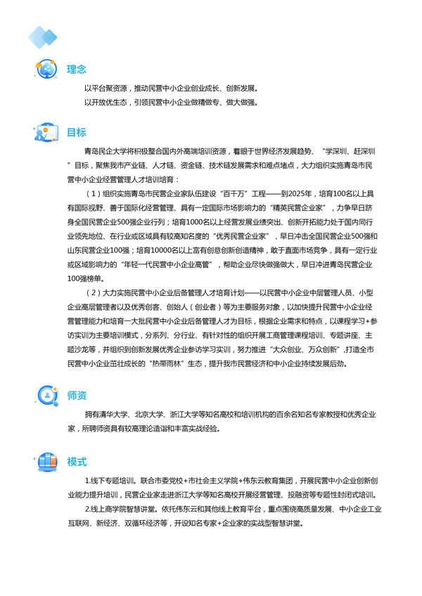 3.高端教育培训资源+灵活多样培训模式,打造全市民营中小企业自己的大学。青岛民企大学作为民营中小企业自己的大学,将重点围绕民营中小企业需求和青岛民营经济发展需要,聚焦民营中小企业高端人才队伍建设和民营企业家“百千万”工程,集聚清华大学、北京大学、浙江大学等知名高校的教育培训智力资源,以时政国情+趋势热点+工商管理课程体系为主要课程内容,并依托伟东云和其他优秀线上教育平台,分层次、分类别、精准化的开展线下专题培训和线上商学院智慧讲堂,切实提升民企大学教育培训的针对性、专业性、实效性,促进全市各个层面民营中小企业加速成长、做强做大。