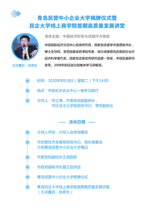 揭牌仪式结束后,举行了青岛民企大学线上商学院首期高质量发展讲堂,中国国际经济交流中心首席研究员、国家发改委学术委原秘书长、博士生导师张燕生做了《中国经济形势与双循环大格局》主题讲座,从国内国际两个维度深度剖析了贸易、投资、市场、区域格局变化及世界经济形势,对企业家在双循环新发展格局下把握大势,调整战略、力争主动具有很强的指导意义,得到了企业家的广泛欢迎。