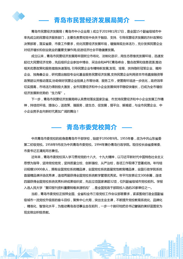 1.这是我市深入贯彻落实习近平总书记重要讲话精神的重要举措。“设立民营企业大学”是我市民营企业家去年提出的,市民营经济局进行了积极研讨和对标交流,在市委市政府领导的关心支持下,市民营经济局联合市委党校、市社会主义学院等,在全国率先成立了民营中小企业大学。这是深入贯彻落实习近平总书记在民营企业座谈会、企业家座谈会上的重要讲话精神的重要举措。青岛民企大学将坚持强化政治站位和政治引领,以习近平总书记新时代中国特色社会主义思想和一系列重要讲话精神为指导,以促进“两个健康”、构建双循环新发展格局、实现青岛市民营经济和中小企业高质量发展为目标,努力建设成为我市促进民营经济和中小企业高质量发展的重要载体,成为我市民营企业家和民营中小企业经营管理者的“人才成长平台”,为我市壮大民营经济攻势聚能赋能,促进全市民营经济和中小企业大发展。