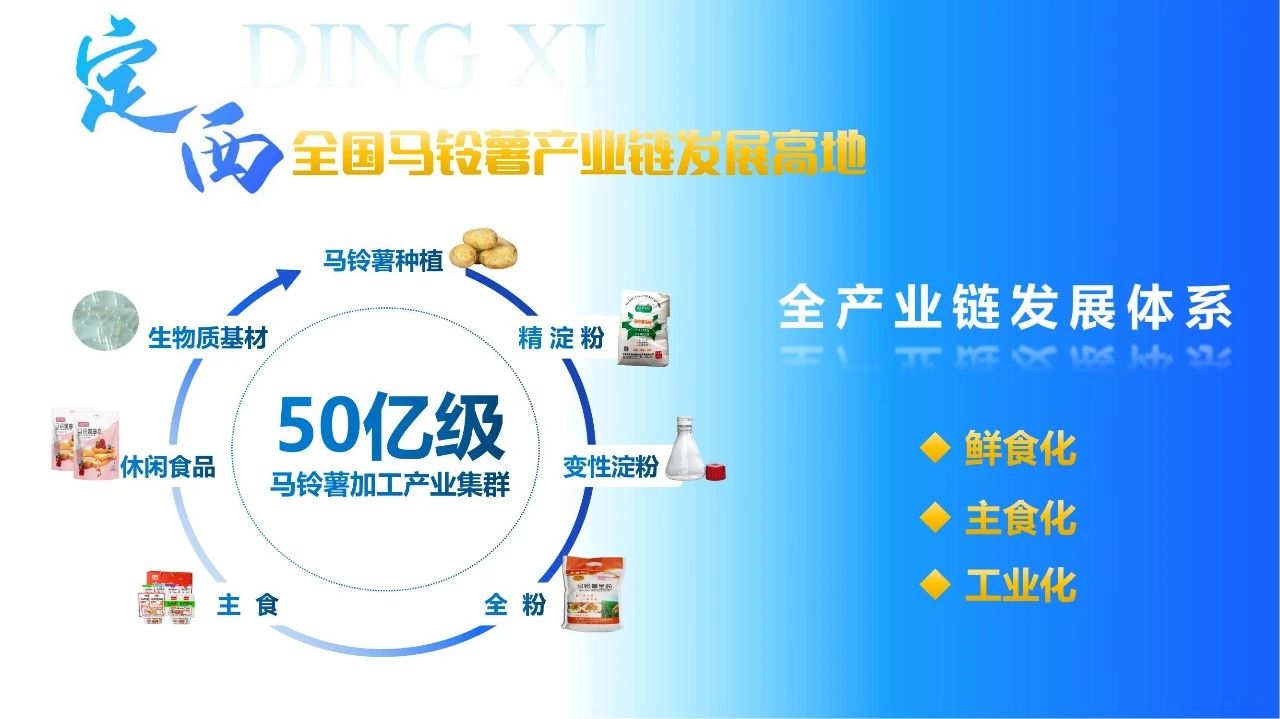 近年来,我们充分利用马铃薯产量及品质优势,加快建设“中国薯都”,打造“定西宽粉”爆款单品,马铃薯产业步入体系化良繁、标准化种植、精深化加工、多元化储藏、高端化研发、品牌化营销的新阶段,基本形成“马铃薯种植—精淀粉—变性淀粉—全粉—主食—休闲食品—生物质基材”精深加工产业链。我们将推动马铃薯全产业转型升级和全链条价值提升,重点引进发展鲜食化、主食化、工业化项目,把“定西宽粉”培育成为国内知名品牌,打造全国马铃薯全产业链发展高地,推动形成50亿级马铃薯加工产业集群。