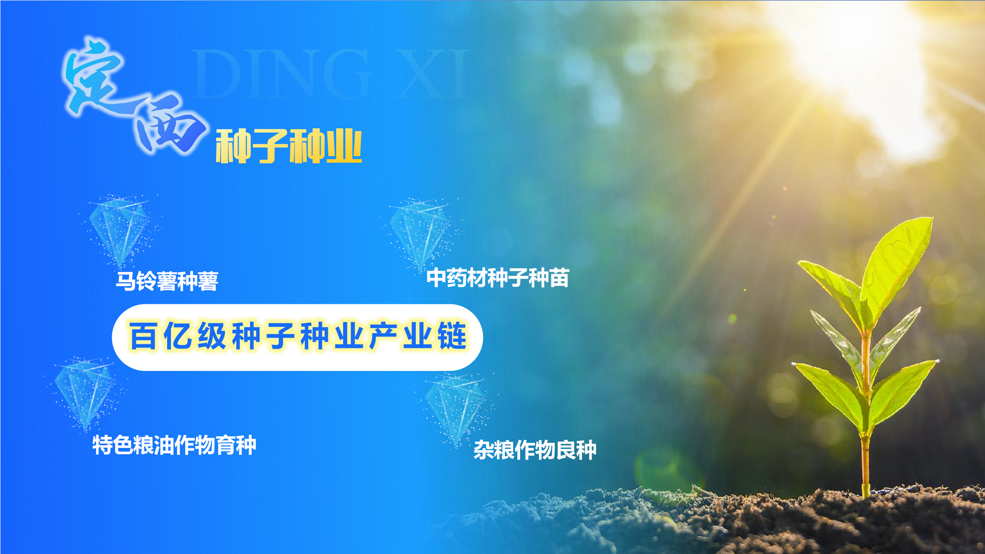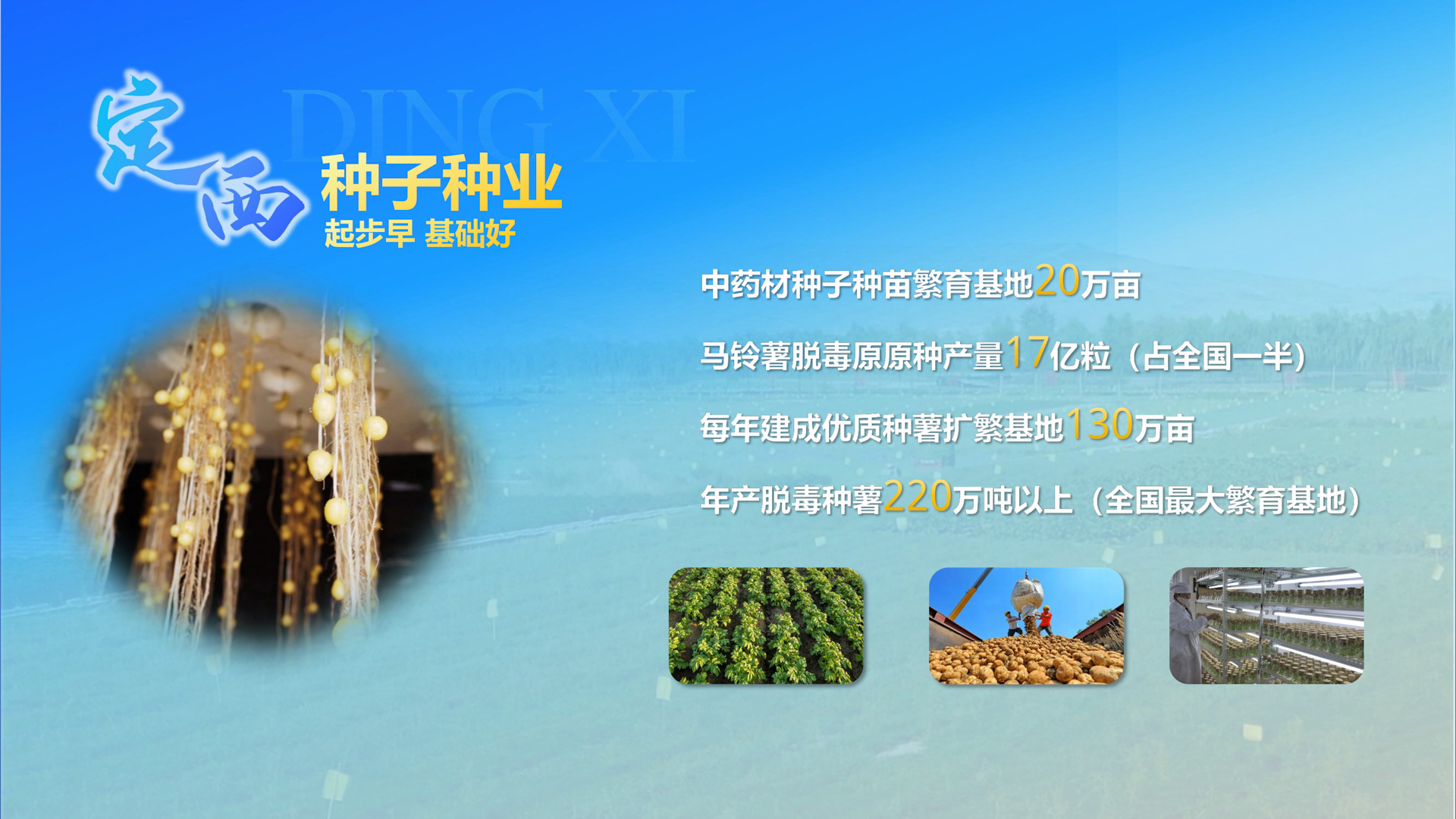 定西马铃薯、中药材、牧草等种子种苗繁育起步早、基础较好,建成中药材种子种苗繁育基地20万亩,马铃薯脱毒原原种产量达17亿粒、占全国一半,每年建成优质种薯扩繁基地130万亩,年产脱毒种薯220万吨以上,是全国最大的脱毒种薯繁育基地。定西市将重点聚焦马铃薯种薯、中药材种子种苗、特色粮油及杂粮作物良种繁育,加快建设全国特色种子种业基地,打造百亿级种子种业产业链。