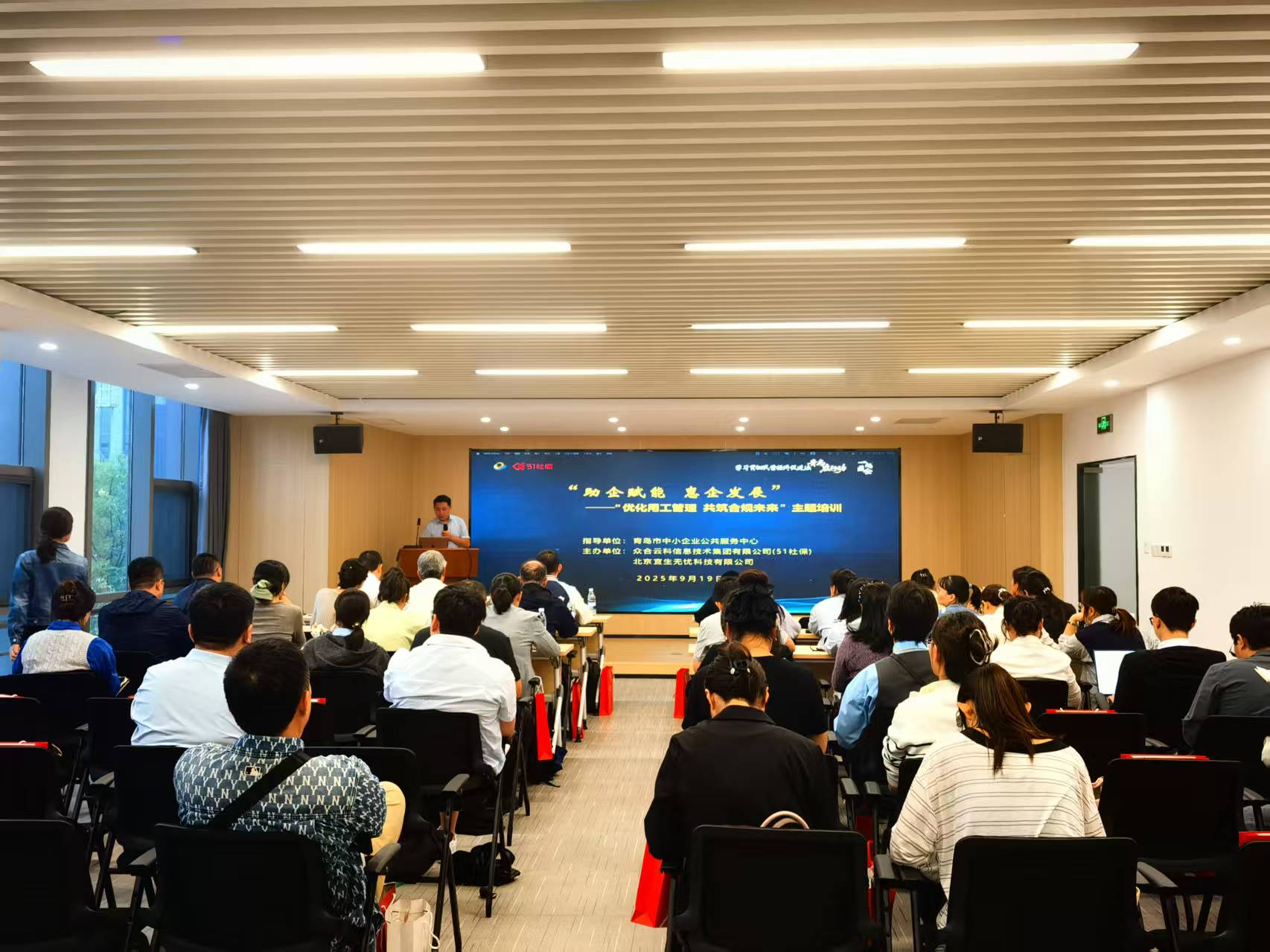2025年9月19日,由青岛市中小企业公共服务中心联合51社保(中智环球(山东)投资有限公司)、北京宜生无忧科技有限公司共同举办的“助企赋能 惠企发展”系列活动之“优化用工管理,共筑合规未来”主题培训在青岛市崂山区澳柯玛崂山智慧产业园顺利举行。本次活动旨在助力企业规范用工管理,强化合规意识与风险防控能力,构建和谐稳定的劳动关系。