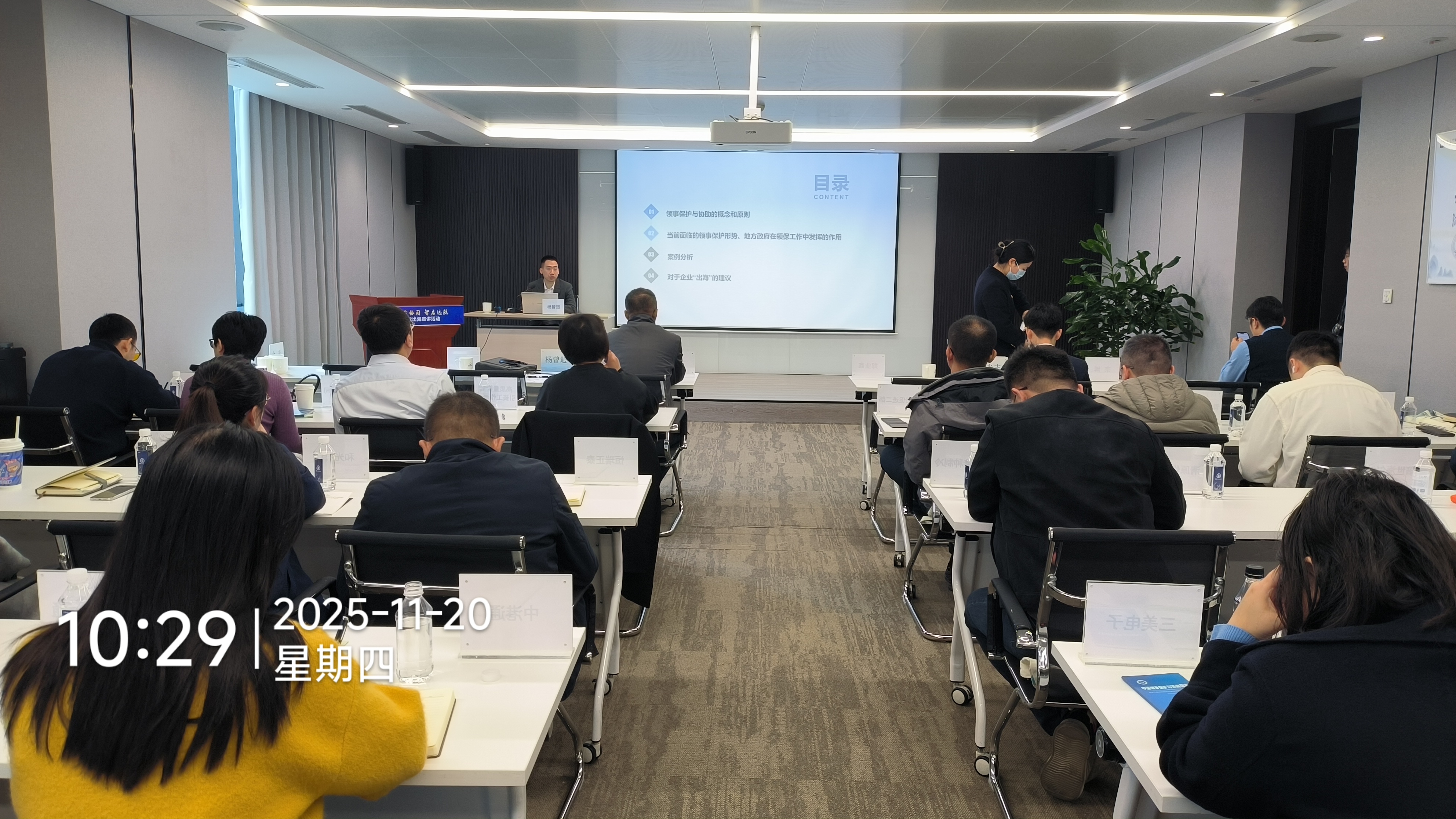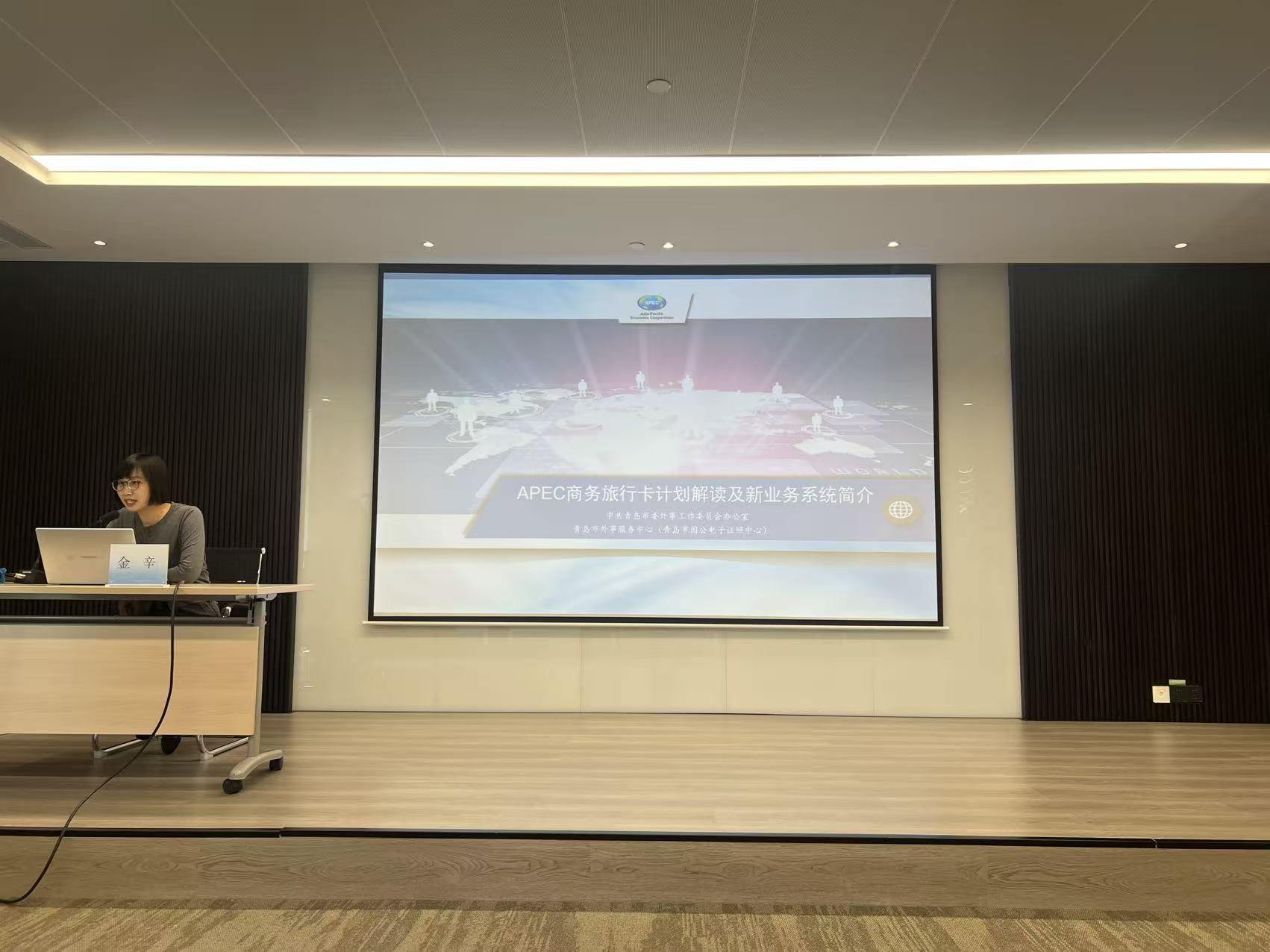 随后,市委外办涉外管理处(领事保护处)杨曾遄主任带来了《领保伴你行共筑平安路》专题讲座。他结合真实案例,系统介绍了我国领事保护工作的职能范围、海外安全风险类型及应急处置流程,强调了“预防是最好保护”的理念,切实增强了企业“走出去”的安全感。最后,青岛市外事服务中心金辛同志详细解读了《APEC商务旅行卡计划及新业务系统》,重点介绍了该“卡”在便利区域内商务往来、缩短签证办理时间方面的显著优势,并现场演示了最新的线上申办流程,为企业高管“走出去”提供了高效便捷的出行方案。
